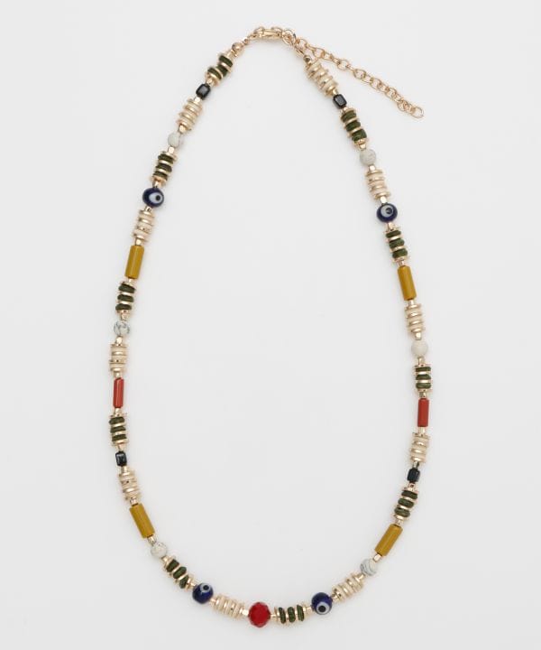 ナザルモチーフをあしらったビーズネックレス。魔除けとして親しまれるナザルの存在感が、日常にさりげないお守りの意味を添える。異素材ビーズの組み合わせがスタイルに洗練されたニュアンスを加えます。