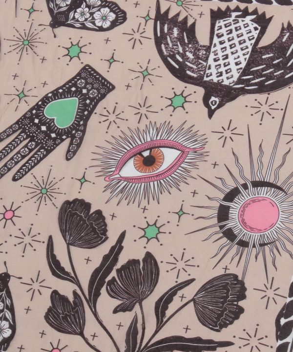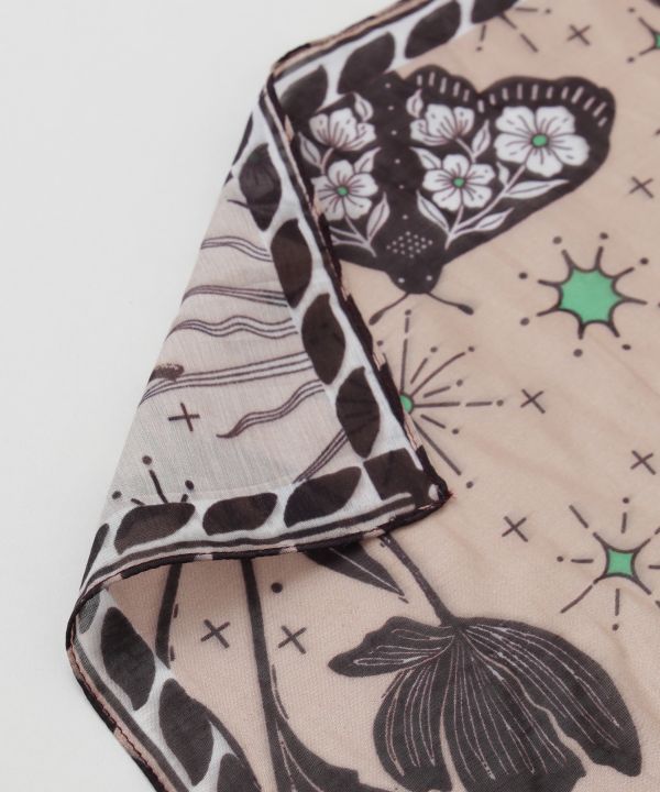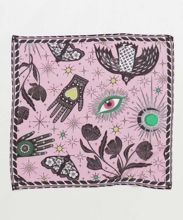 トルコのお守りをイメージしたモチーフを、透け感のある軽やかな素材にのせたスカーフ。首や腰に巻いたり、ヘッドアクセにも使えるコーデのアクセントアイテム。