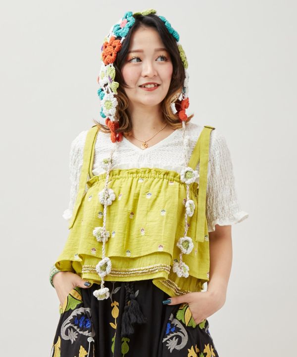 インドの民族衣装のレヘンガのトップス「チョリ」を、現代的にアレンジしたショート丈トップス。肩紐で長さ調節が可能で、裾のビーズ刺繍が華やかなアクセント。同シリーズのスカートと合わせてセットアップで着るのもおすすめ。