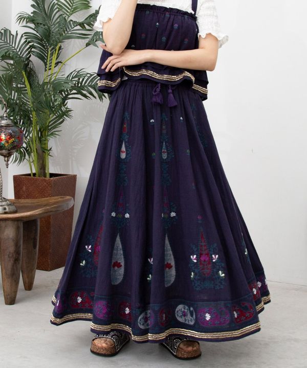 インド伝統衣装のレヘンガを現代風にアレンジした贅沢スカート。裾にあしらわれたビーズ刺繍が華やかさを演出。ボリュームのあるシルエットで存在感抜群。同シリーズのシャツやトップスと合わせてセットアップで着るのもおすすめ。