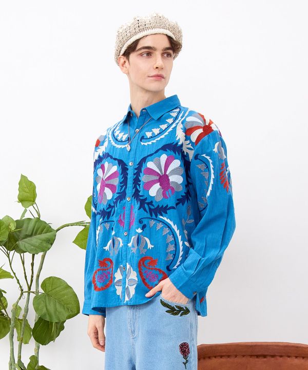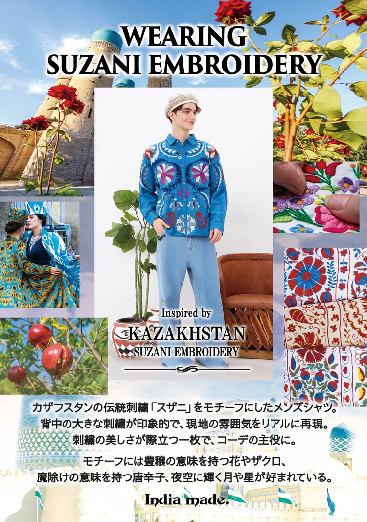 カザフスタンの伝統刺しゅう「スザニ」をモチーフにしたメンズシャツ。背中の大きな刺しゅうが印象的で、現地の雰囲気をリアルに再現。刺しゅうの美しさが際立つ一枚で、コーデの主役に。