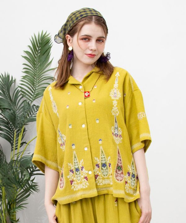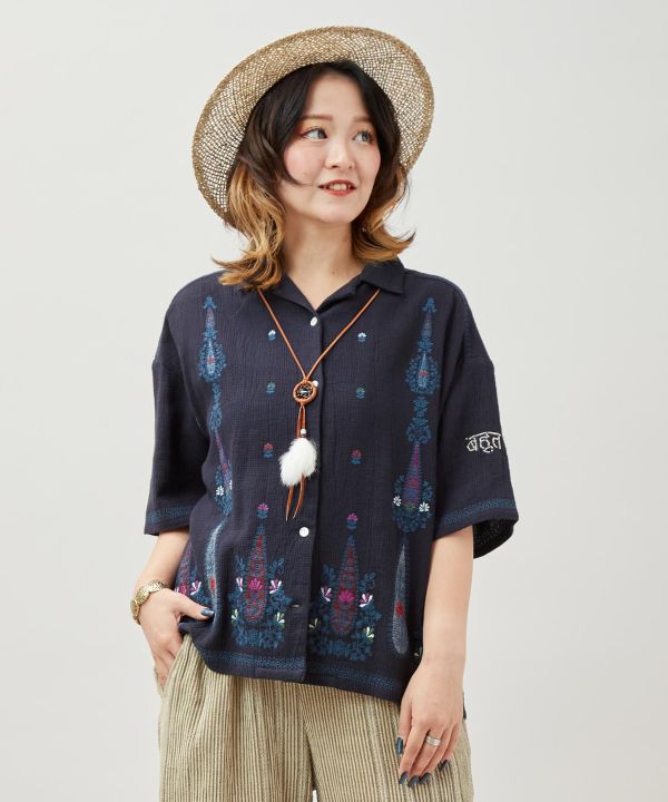 インドの民族衣装レヘンガのエッセンスを取り入れた開襟シャツ。袖口には「とても美しい」という意味のヒンディー語がビーズ刺繍であしらわれ、細部にまでこだわりが光る。軽やかな着心地で季節を問わず活躍。
