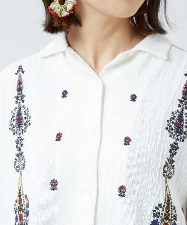インドの民族衣装レヘンガのエッセンスを取り入れた開襟シャツ。袖口には「とても美しい」という意味のヒンディー語がビーズ刺しゅうであしらわれ、細部にまでこだわりが光る。軽やかな着心地で季節を問わず活躍。