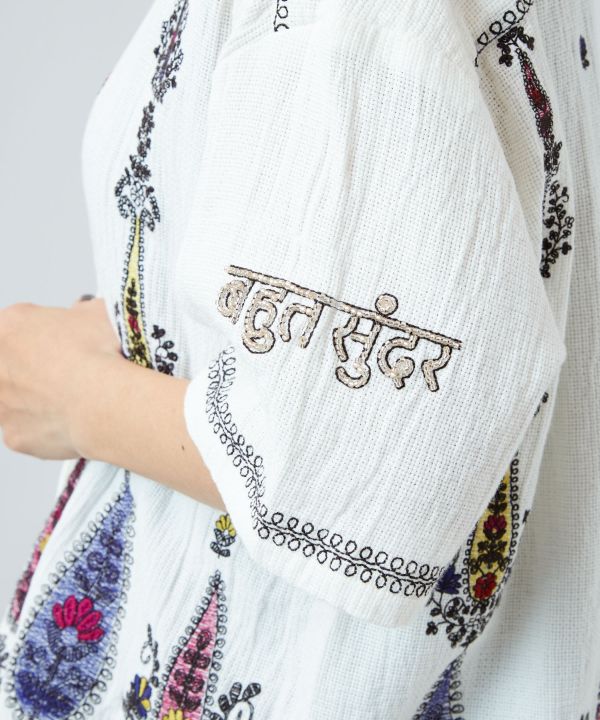 インドの民族衣装レヘンガのエッセンスを取り入れた開襟シャツ。袖口には「とても美しい」という意味のヒンディー語がビーズ刺しゅうであしらわれ、細部にまでこだわりが光る。軽やかな着心地で季節を問わず活躍。