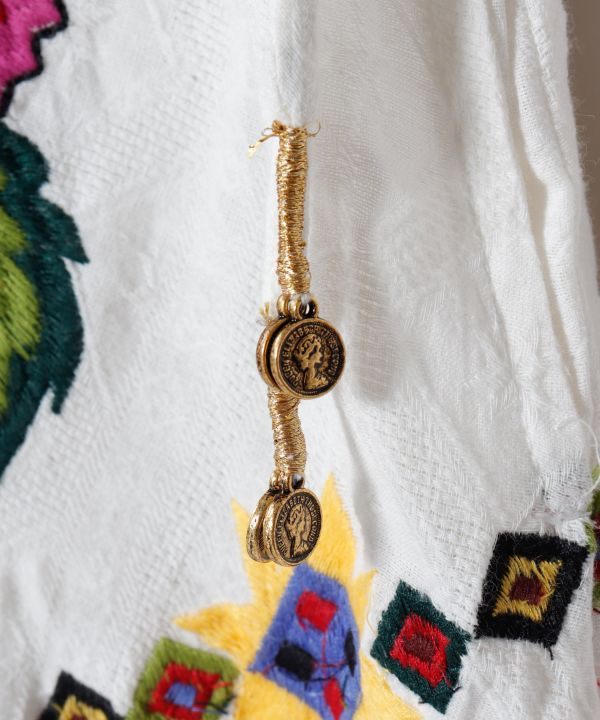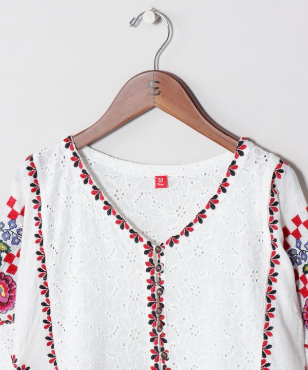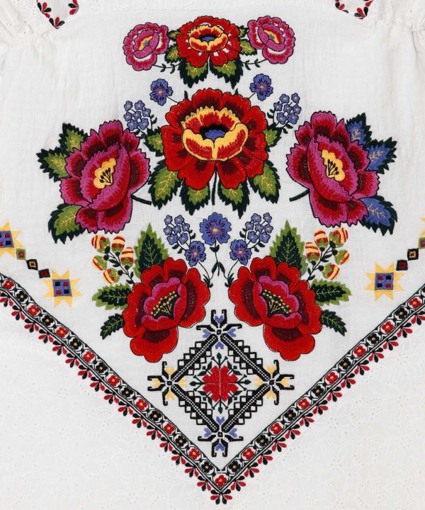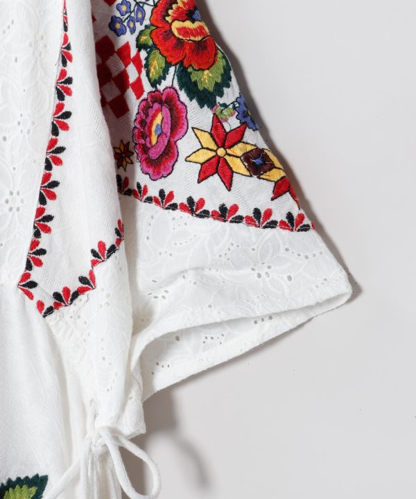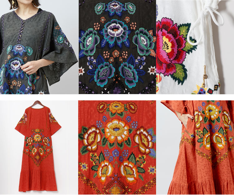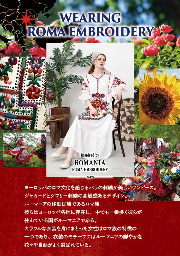 ヨーロッパのロマ文化を感じるバラの刺しゅうが美しいワンピース。ジャカードとシフリー刺しゅうの高級感あるデザイン。まるで刺しゅうエプロンを纏っているような個性派アイテム。