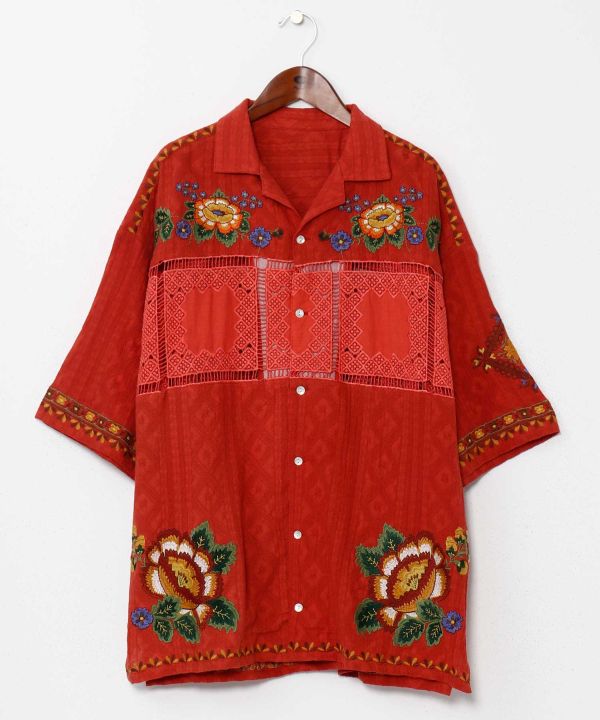 ヨーロッパのロマ文化にインスパイアされたバラ刺繍のメンズシャツ。ジャカードとレースを組み合わせた贅沢なディテールが魅力。