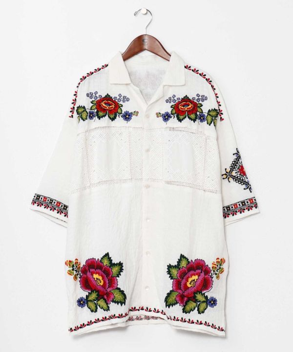 ヨーロッパのロマ文化にインスパイアされたバラ刺繍のメンズシャツ。ジャカードとレースを組み合わせた贅沢なディテールが魅力。