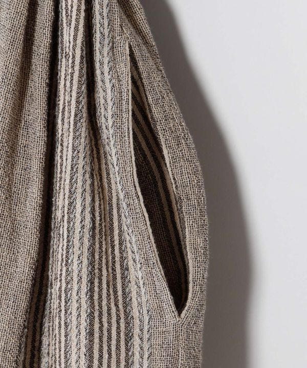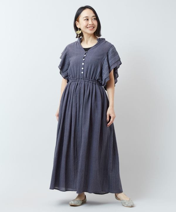 南インドの綿素材を使用したノースリーブワンピース。袖のダブルフリルがフェミニンな印象で、ウエストゴム仕様によりゆったり着られる一枚。