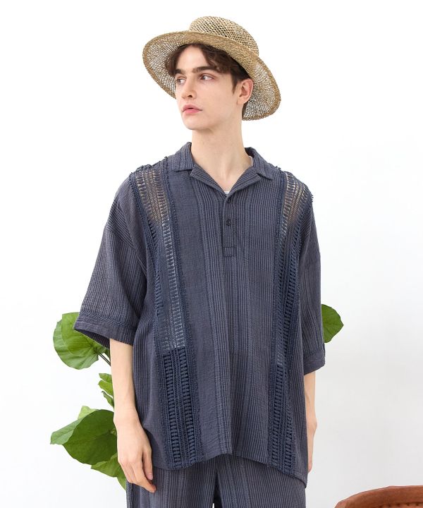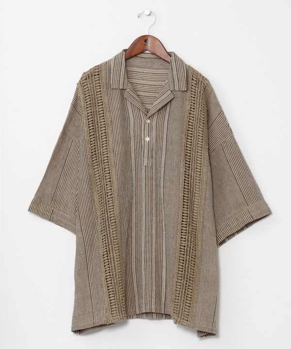 南インドの織り生地と大胆なレース使いが目を惹くプルオーバー。オーバーサイズでリラックス感があり、涼やかな風合いが魅力の綿素材トップス。