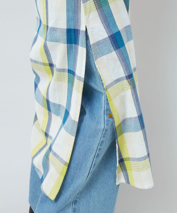 インドの伝統衣装「サリー」から着想を得たワンピース。南インド伝統のマドラスチェックと金糸を織り込んだデザイン。裾のストリングでアレンジ可能な変形シルエット。軽やかで個性的なスタイリングが楽しめる一着。