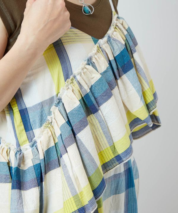 インドの伝統衣装「サリー」から着想を得たワンピース。南インド伝統のマドラスチェックと金糸を織り込んだデザイン。裾のストリングでアレンジ可能な変形シルエット。軽やかで個性的なスタイリングが楽しめる一着。