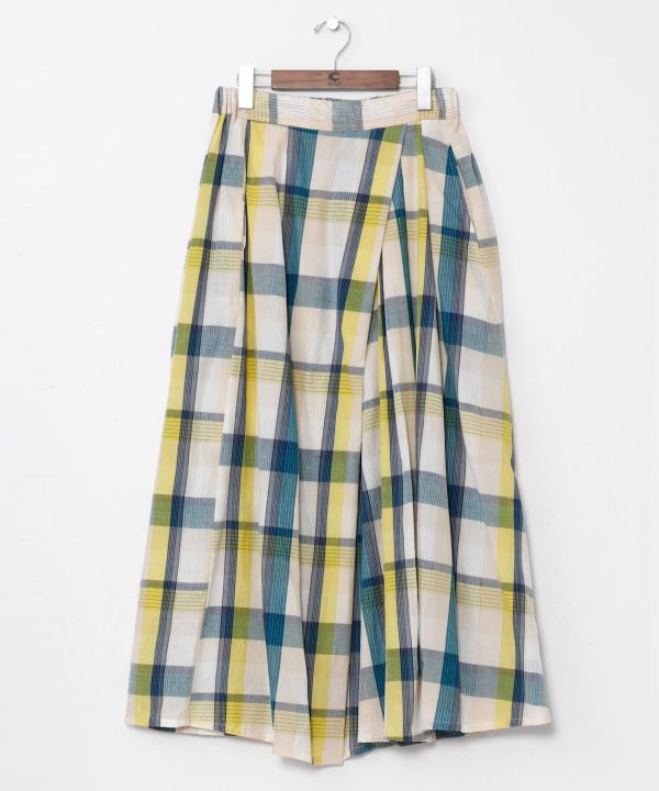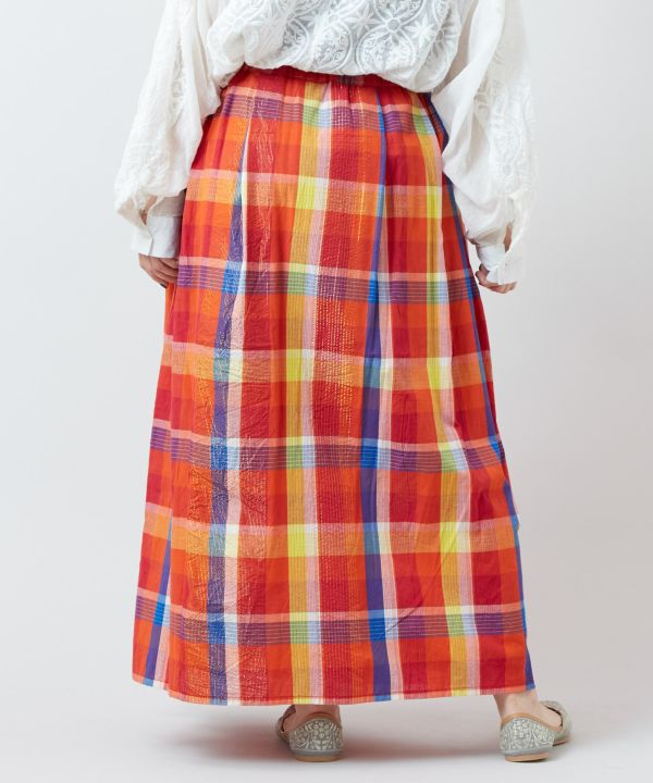 インドの伝統衣装「サリー」からインスパイアされたアシンメトリースカート。裏地付き仕様で、マドラスチェックと金糸が高級感を演出。ウエストゴムとポケット付きで快適。