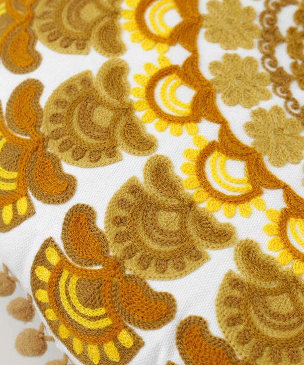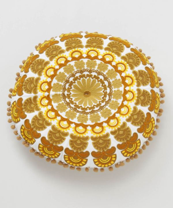 インドの伝統刺しゅうをたっぷり施したラウンドクッション。ソファやベッドに置くだけで、お部屋がぐっと華やかに。異国情緒漂うアクセントとしておすすめ。