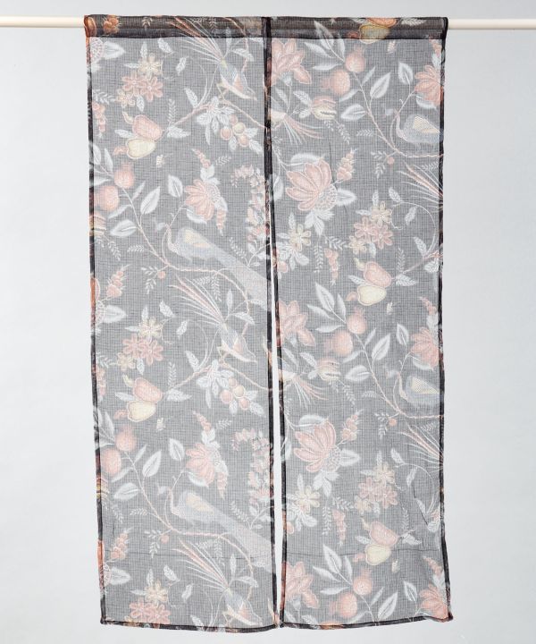 花や鳥、果物などをあしらった柄が美しいノレン。インド・ラジャスタン地方の伝統織物コタドリアを使用し、透け感のある軽やかな素材が風に揺れて心地よいリズムを生む。お部屋にやさしい彩りを添える一枚。