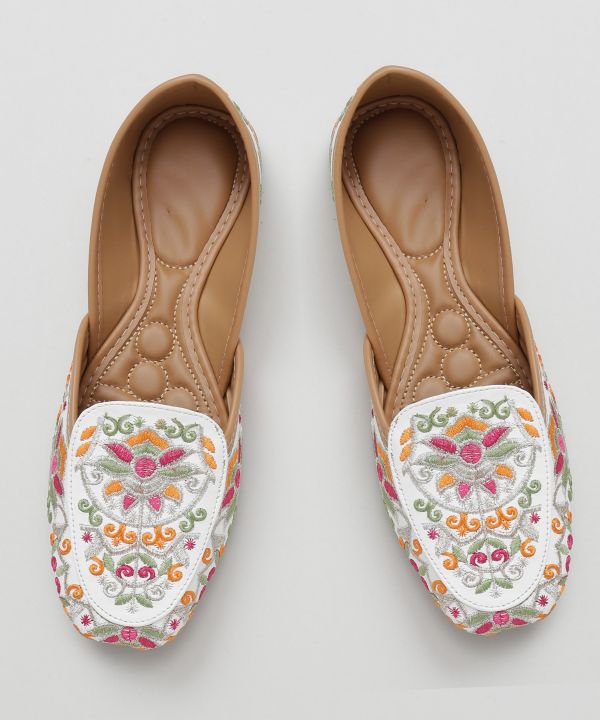 インドの伝統靴ジュッティに、華やかな花の刺しゅうを施したデザイン。合皮素材にカラフルな糸が映え、足元を彩る一足。クッション性があり、歩きやすさも魅力。