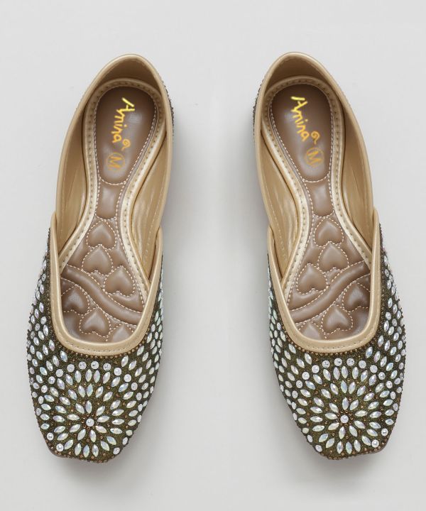 キラキラと輝くビジューをあしらった、インド伝統のフラットシューズ「ジュッティ」。足元をエキゾチックに演出しつつ、クッション性で快適な履き心地を実現。