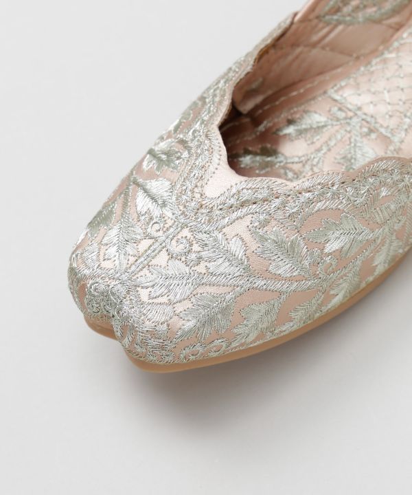 植物モチーフの刺しゅうがエレガントに映える、ジュッティタイプのフラットシューズ。インドの伝統と華やかさを取り入れつつ、歩きやすさにもこだわった一足。