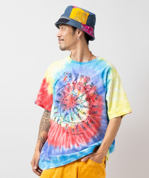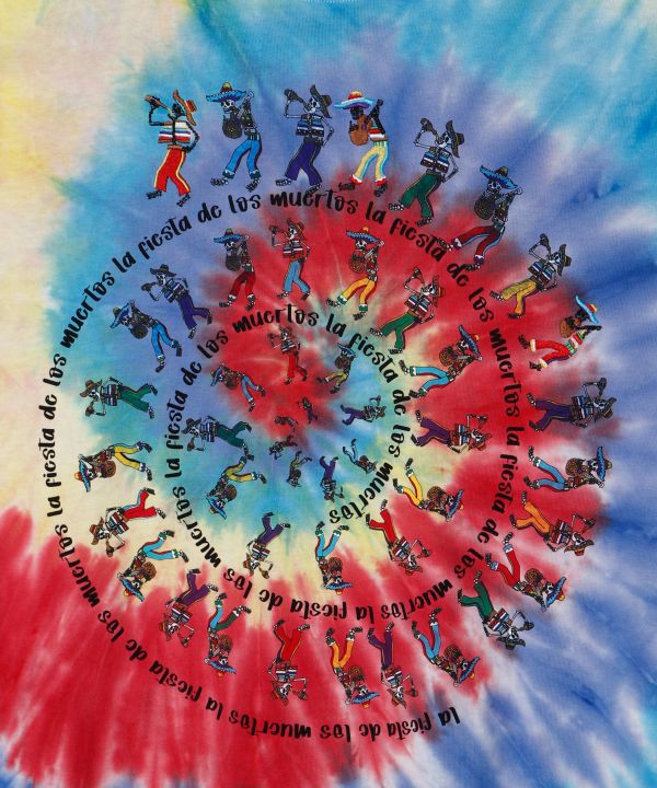 【Amina×grn】死者の日(Dia de los Muertos)をテーマにした刺しゅう入りTシャツ。タイダイと演奏しながら行進しているカラベラ柄が重なりインパクト抜群。型崩れしにくい素材感とゆったりシルエットも魅力。