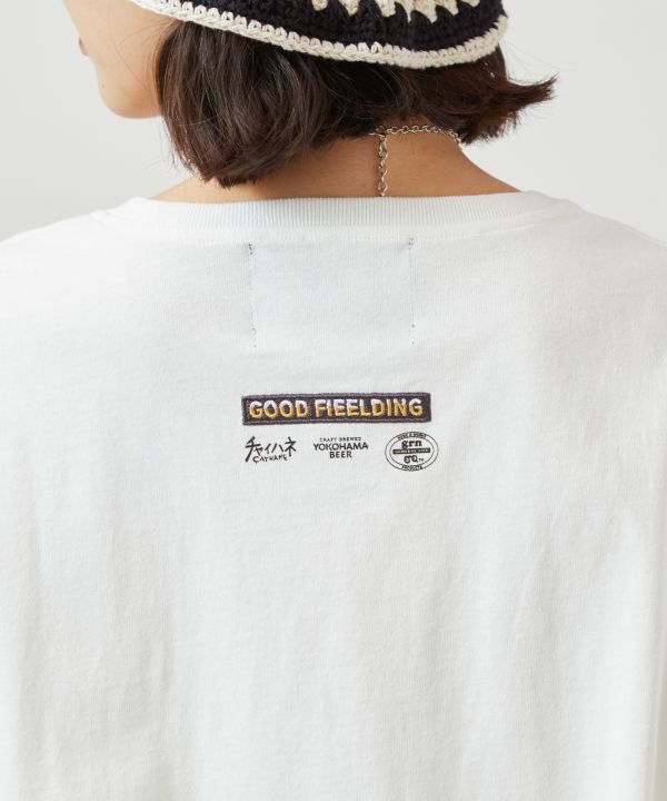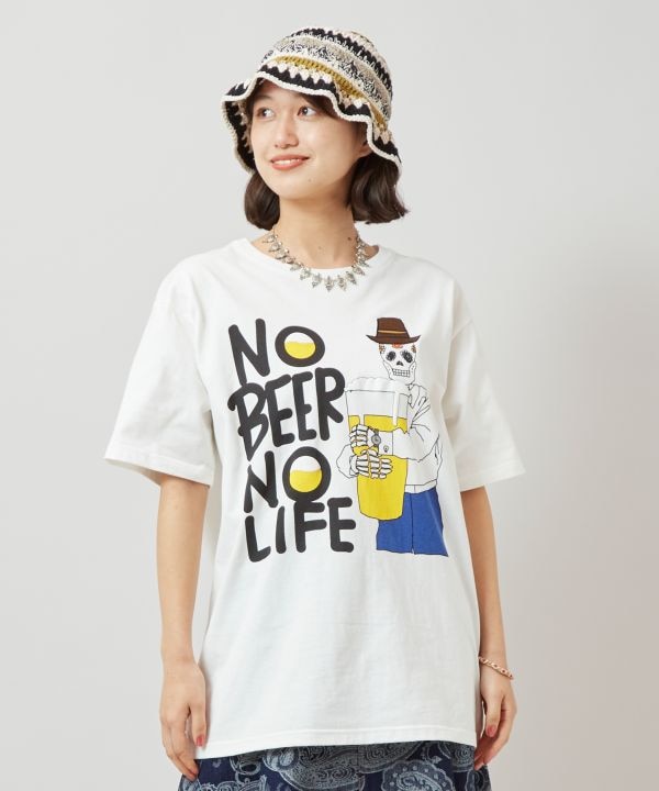 【Amina×YOKOHAMA BEER×grn】ビールを抱えるカラベラ柄がユニーク。ゆったり着られて発泡プリントの遊び心も光るTシャツ。