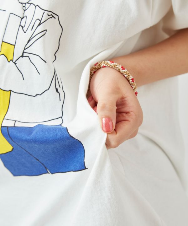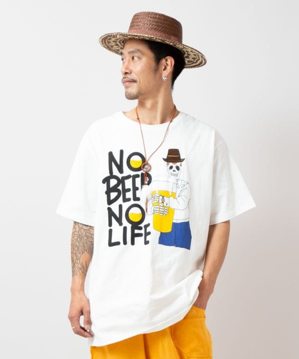 【Amina×YOKOHAMA BEER×grn】ビールを抱えるカラベラ柄がユニーク。ゆったり着られて発泡プリントの遊び心も光るTシャツ。
