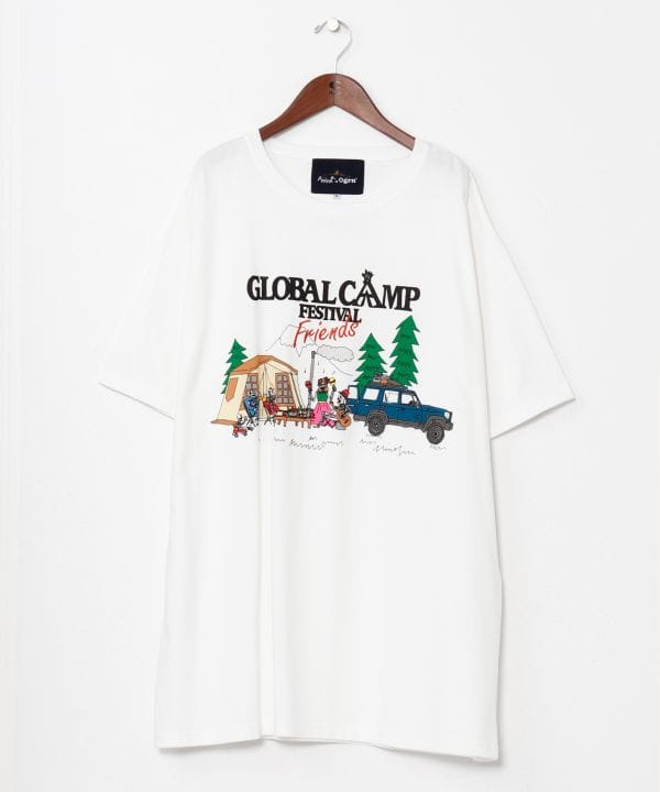 【Amina×grn×ogawa】コラボTシャツ。キャンプを楽しむカラベラ家族を大胆プリント&一部刺しゅうで表現。L・XLのゆったりサイズ展開。