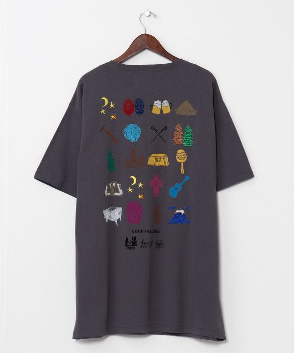 【Amina×grn×ogawa】チャイハネ主催のキャンプイベント『GLOBAL CAMP FESTIVAL』をテーマにしたTシャツ。刺しゅうとプリントの組み合わせでこだわり満載。富士山を背景とする舞台に、ogawaのテントでキャンプを楽しむカラベラ家族を表現。自然とつながり、世界とつながる。そんな新しい外遊びのスタイルを提案するシリーズ。