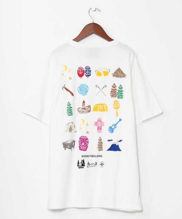 【Amina×grn×ogawa】チャイハネ主催のキャンプイベント『GLOBAL CAMP FESTIVAL』をテーマにしたTシャツ。刺しゅうとプリントの組み合わせでこだわり満載。富士山を背景とする舞台に、ogawaのテントでキャンプを楽しむカラベラ家族を表現。自然とつながり、世界とつながる。そんな新しい外遊びのスタイルを提案するシリーズ。