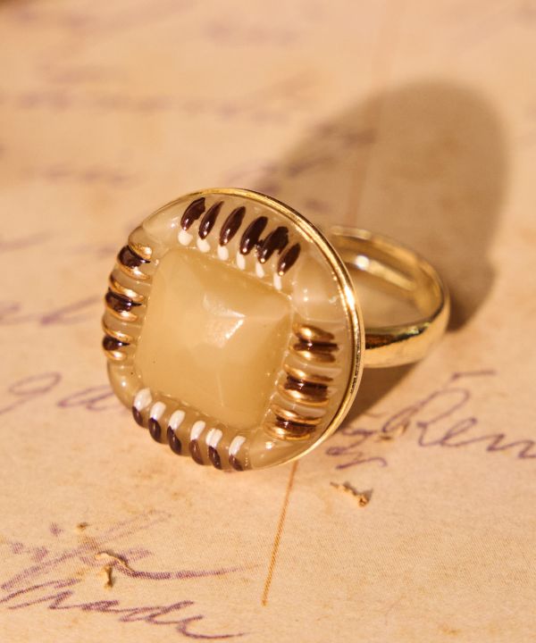 ガラスの輝きが美しく、アンティーク感あふれる指輪。繊細な彫刻模様が手元を彩り、旅先で出会った一点物のような特別感に。