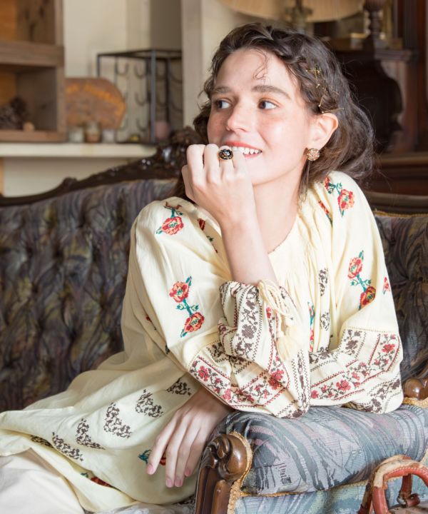 ガラスの輝きが美しく、アンティーク感あふれる指輪。繊細な彫刻模様が手元を彩り、旅先で出会った一点物のような特別感に。
