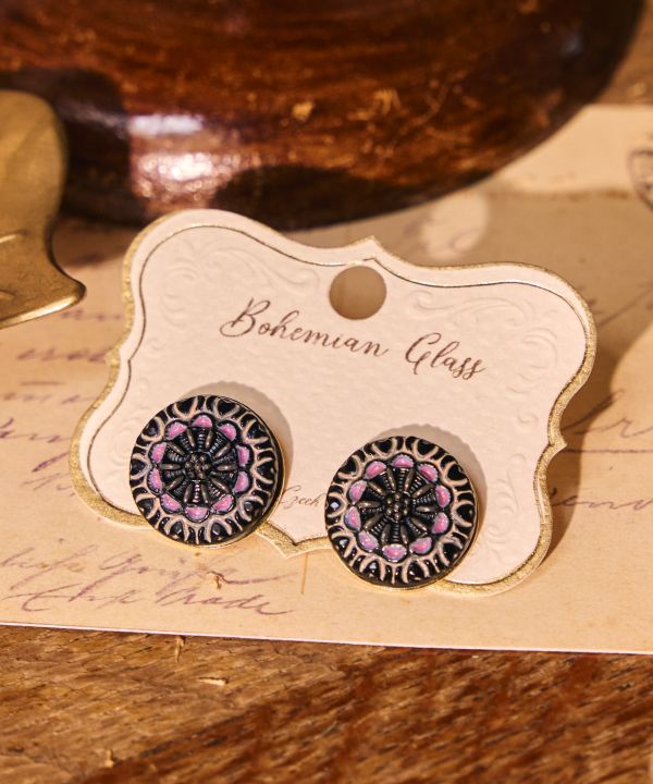 チェコガラスならではの透明感が魅力。繊細な彫刻模様とアンティーク風の仕立てが耳元を華やかに飾る上品なピアスです。