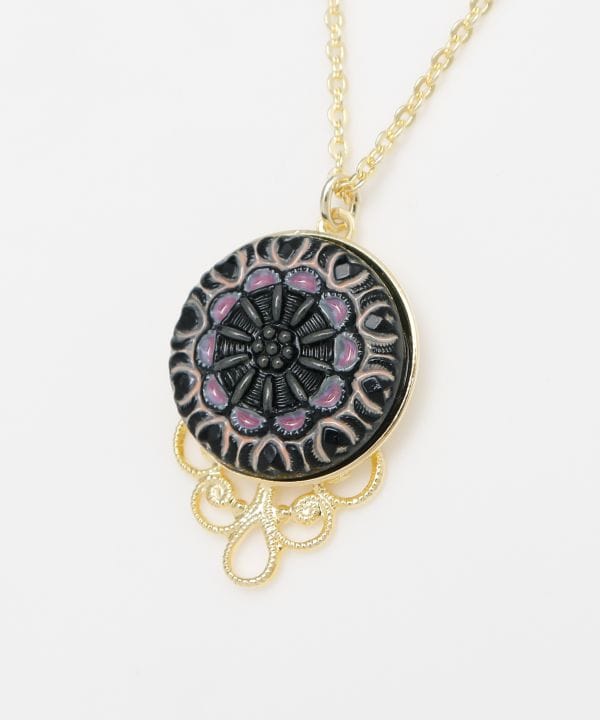 チェコボタンの魅力をそのままに仕立てたネックレス。透けるガラスと金属のコントラストが美しく、デコルテに優雅な彩りを添えます。