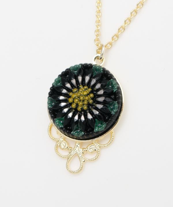 チェコボタンの魅力をそのままに仕立てたネックレス。透けるガラスと金属のコントラストが美しく、デコルテに優雅な彩りを添えます。