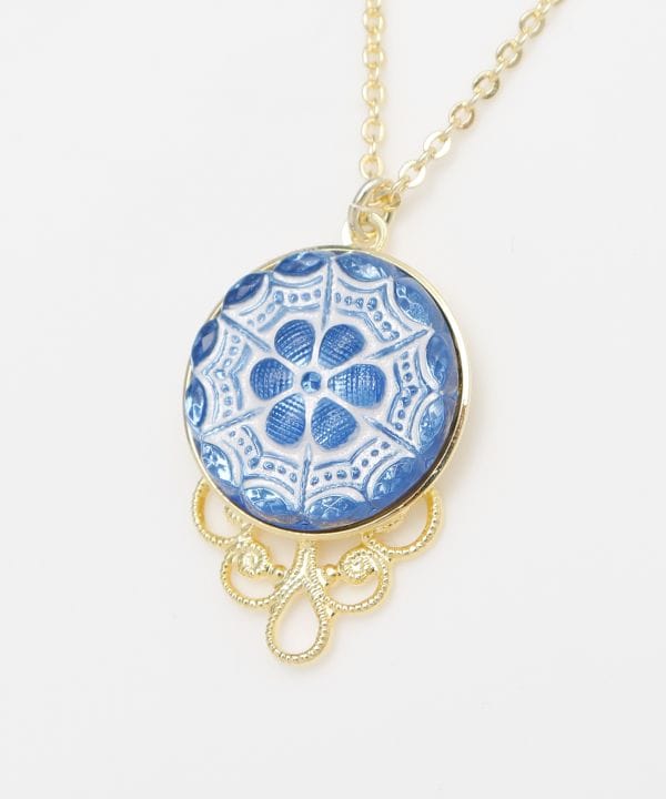 チェコボタンの魅力をそのままに仕立てたネックレス。透けるガラスと金属のコントラストが美しく、デコルテに優雅な彩りを添えます。