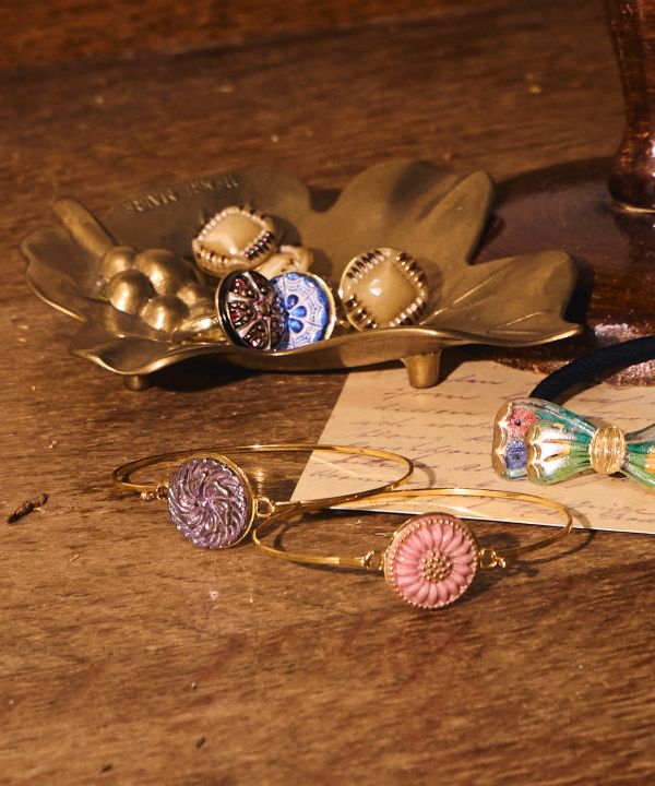 チェコガラスのボタンがきらめくブレスレット。ゴールドメッキと組み合わせたクラシカルなデザインで、手元に上品なアクセントをプラス。