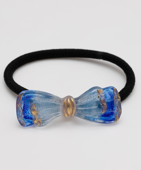 チェコボタンを主役にしたリボン型のヘアゴム。輝きを放つモチーフが華やかに彩ります。さりげなく個性を演出したい日にぴったり。