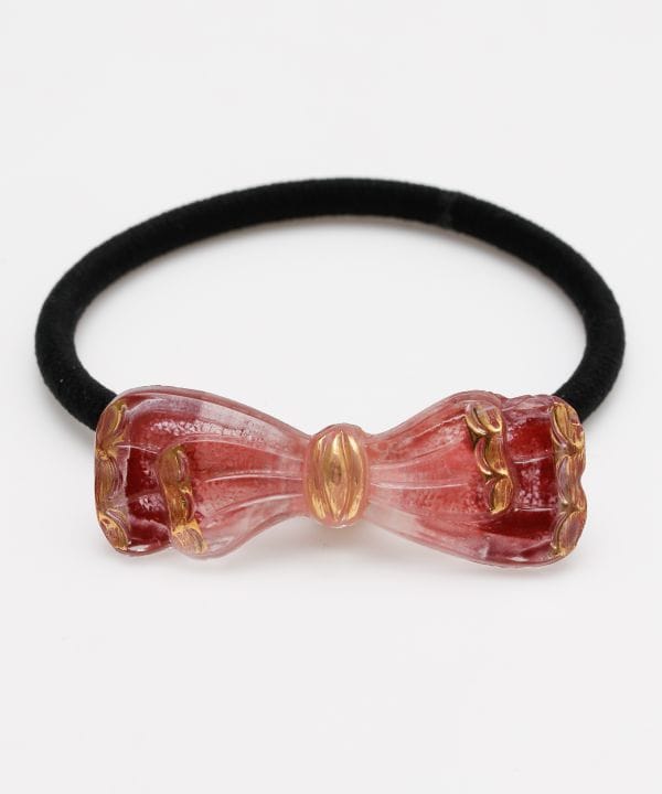 チェコボタンを主役にしたリボン型のヘアゴム。輝きを放つモチーフが華やかに彩ります。さりげなく個性を演出したい日にぴったり。