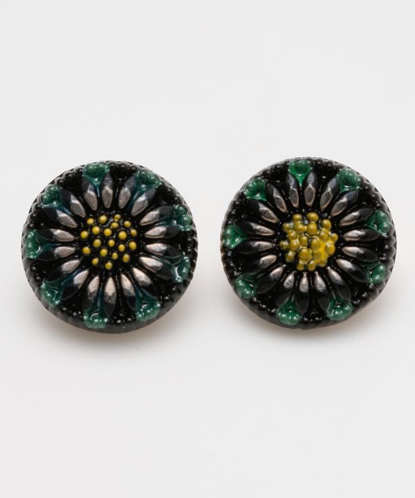 チェコガラスのボタンが印象的なイヤリング。繊細なカットとゴールドメッキの輝きが上品なバランスで、クラシカルな装いにもぴったりの一点もの感あふれるデザイン。