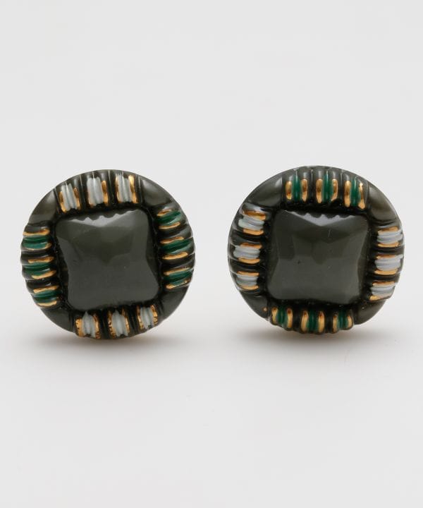 チェコガラスのボタンが印象的なイヤリング。繊細なカットとゴールドメッキの輝きが上品なバランスで、クラシカルな装いにもぴったりの一点もの感あふれるデザイン。