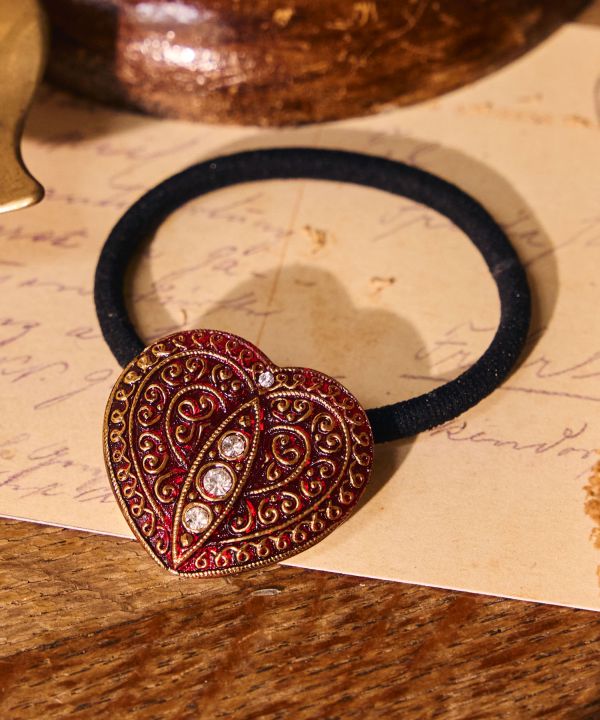 丸みのあるハート型のチェコボタンが印象的なヘアゴム。アンティーク風のモチーフと手軽さも魅力。旅先のお土産のような特別感。