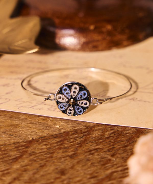 チェコガラスと錫(すず)メッキの真鍮を組み合わせたブレスレット。手元に品のある光を添える、アンティーク調の雰囲気漂うデザインが特徴の一点。