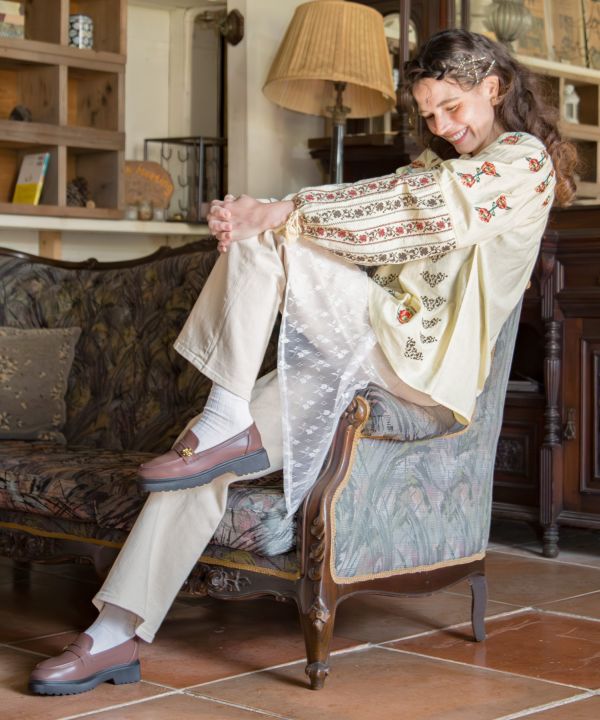 クラシカルなフォルムに厚底ソールを組み合わせたローファー。甲部分にはバラのモチーフを添え、さりげなく華やかさを演出。デザイン性と歩きやすさを兼ね備えた一足です。