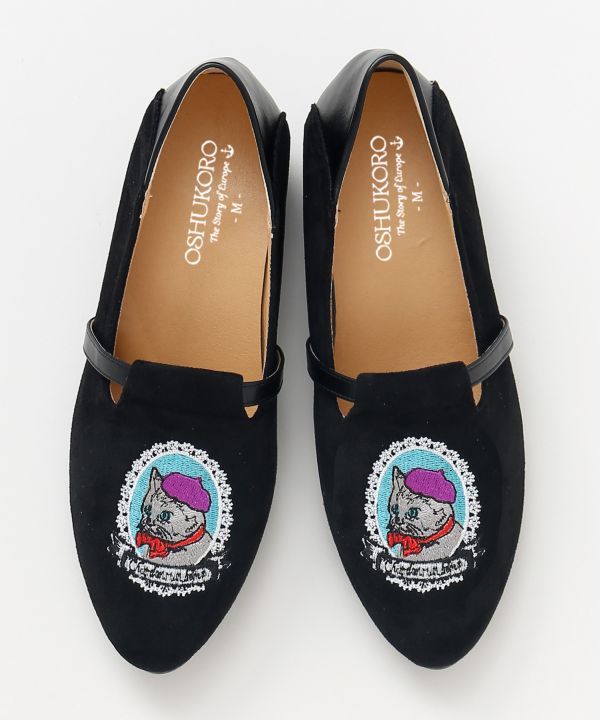 アンティークな猫のカメオを刺しゅうで表現した靴。ベレー帽をかぶった猫は欧州航路だけのオリジナルモチーフで、足元に遊び心と個性を添える一足です。