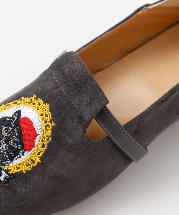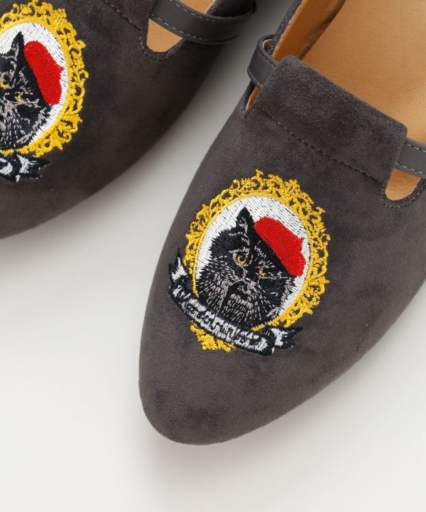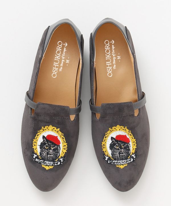 アンティークな猫のカメオを刺しゅうで表現した靴。ベレー帽をかぶった猫は欧州航路だけのオリジナルモチーフで、足元に遊び心と個性を添える一足です。
