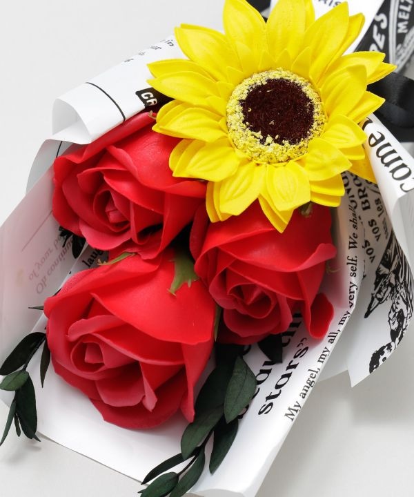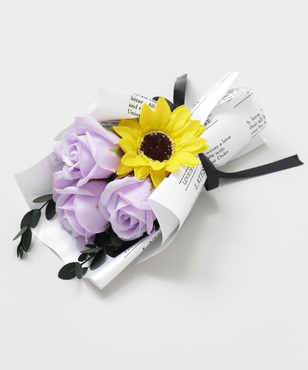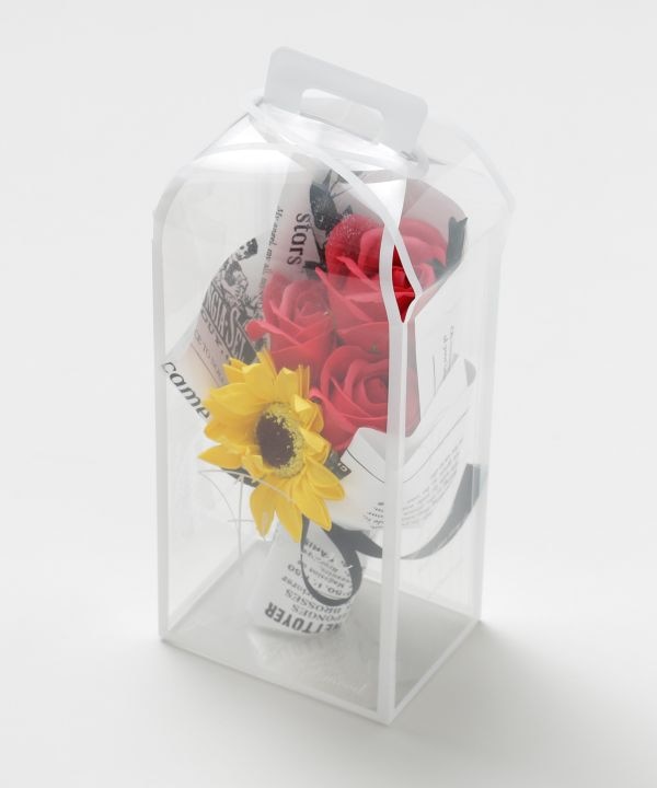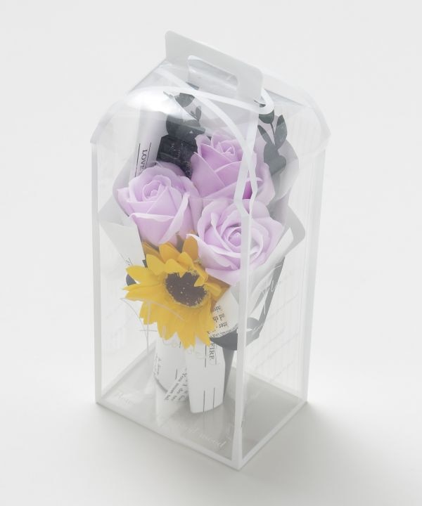 可憐なフローブーケは、クリアケース入りでそのまま贈り物にも。華やかな彩りがインテリアや特別な日の演出にぴったりのアイテムです。