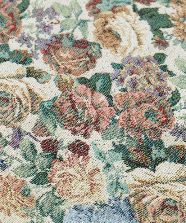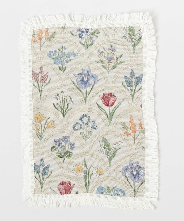 繊細な花柄が美しいアンティーク調のゴブラン織りマット。立体感のある織りとフリンジの縁取りが、クラシカルで温かみのある雰囲気を演出します。空間に上品な彩りを添えるアクセントアイテムです。