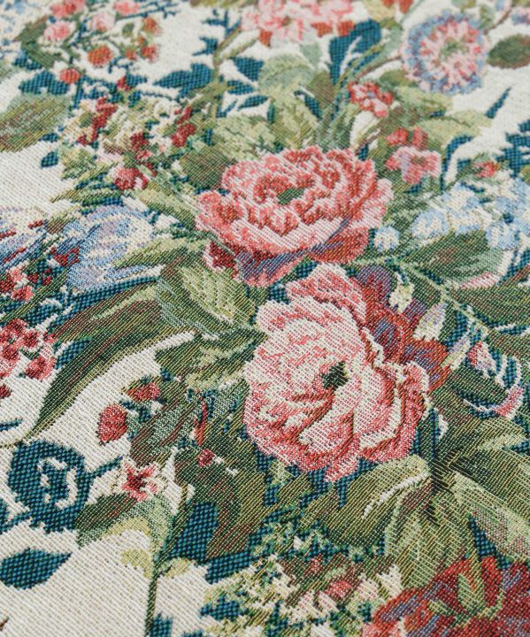 繊細な花柄が美しいアンティーク調のゴブラン織りマット。立体感のある織りとフリンジの縁取りが、クラシカルで温かみのある雰囲気を演出します。空間に上品な彩りを添えるアクセントアイテムです。