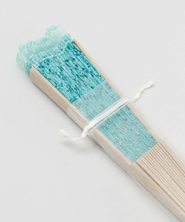 繊細なレースをあしらったレースの扇子。透け感のある布地が上品で涼しげな印象に。持ち運びに便利な袋付きです。