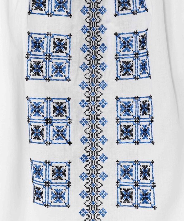 ルーマニア・トランシルヴァニア地方の刺しゅうデザインをモチーフにしたクラシカルなブラウス。幾何学模様の刺しゅうが印象的で、襟まわりのギャザーが華やかなアクセントに。民族衣装の雰囲気を残しながらも、軽やかに着こなせるデザインです。