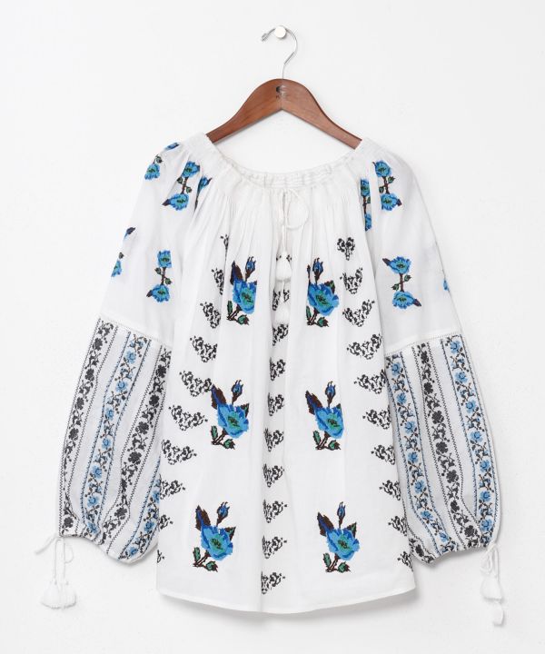 ウクライナ刺しゅう(ヴィシヴァンカ)をモチーフにしたクラシカルなブラウス。魔除けの象徴とされる芥子(けし)の実など、意味を持つモチーフをたっぷりと刺しゅうで表現。襟まわりのギャザーが華やかさを添え、民族衣装の要素を残しながらも軽やかに着こなせる一着です。