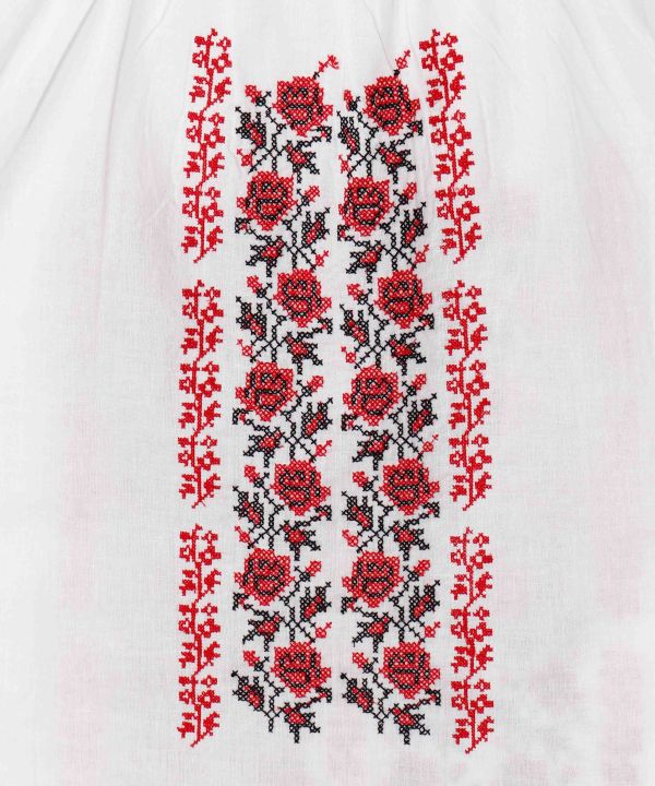 ウクライナ刺しゅう(ヴィシヴァンカ)をモチーフにした、華やかなバラの刺しゅうが目を惹くクラシカルなブラウス。バラは愛や美しさ、豊穣の象徴とされ、袖口のカフスが上品な印象を演出します。民族衣装のエッセンスを取り入れつつ、日常にもなじむデザインです。
